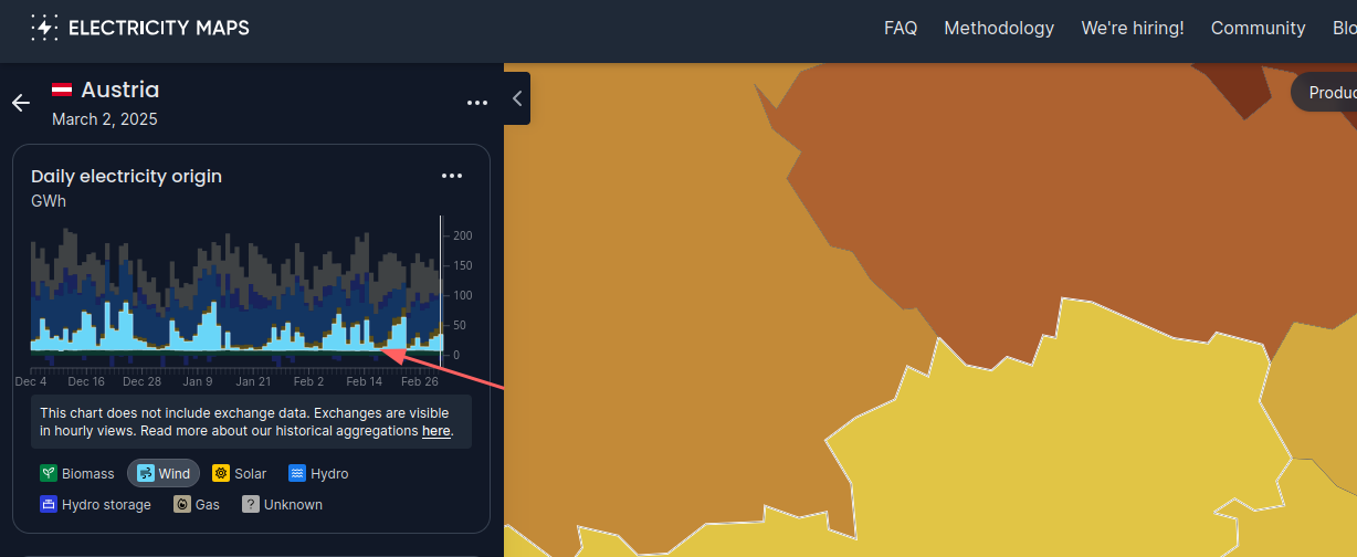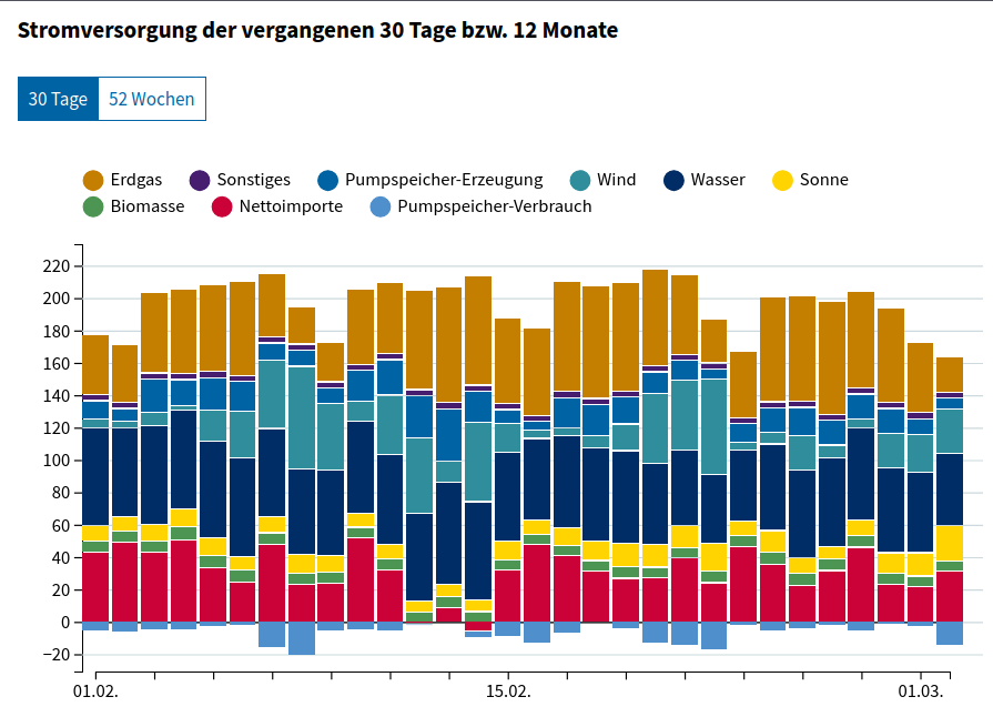 Unter Woher kommt Österreichs Strom? | energie.gv.at findet man Daten über die Stromquellen der letzten 30 Tage bzw. 52 Wochen.