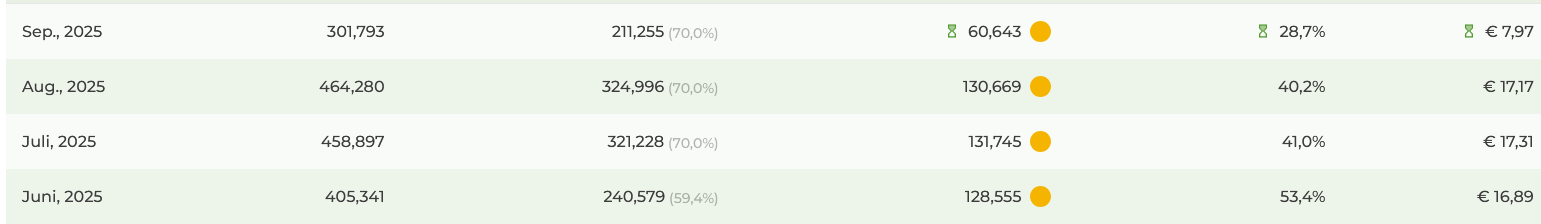 | Jul 2025 | 190,04 | € 22,08 | 11,62 | € 52,69 | 13,14 |